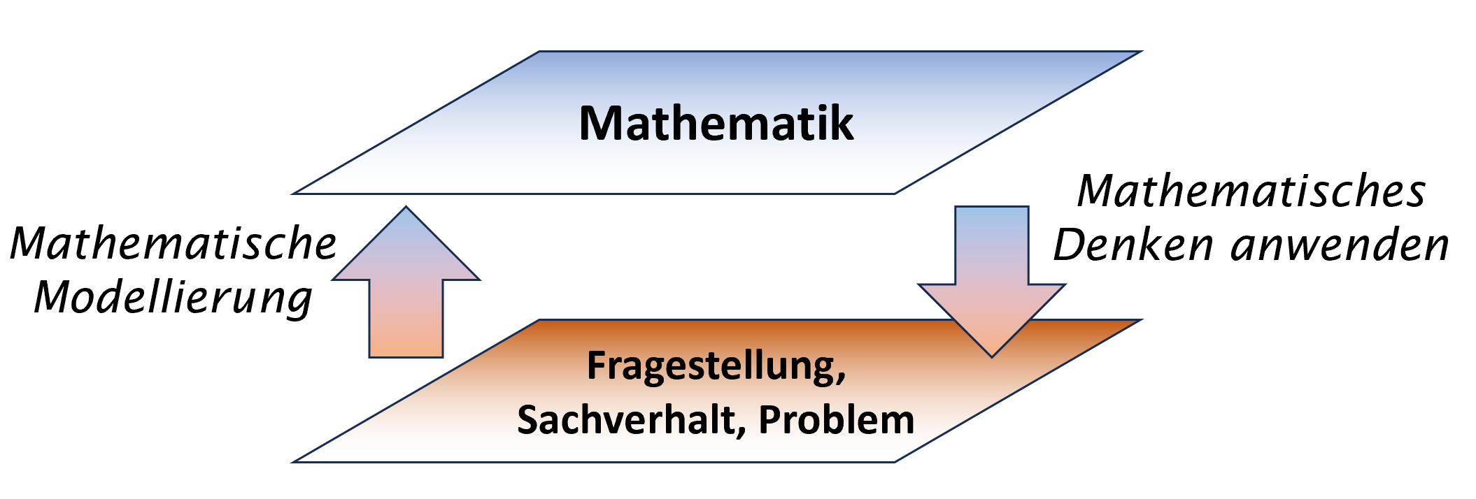 Mathematik als unabhängige Disziplin kann idealerweise in einer eigenen Welt/Ebene dargestellt werden. Die Verbindungen zur realen Welt können dann wie folgt visualisiert und beschrieben werden: